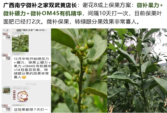 微補果力500倍+微補硼力1500倍+微補OM45有機精華500倍,謝花八成開始,保果期連噴3次,每月2-3次,間隔10-14天。