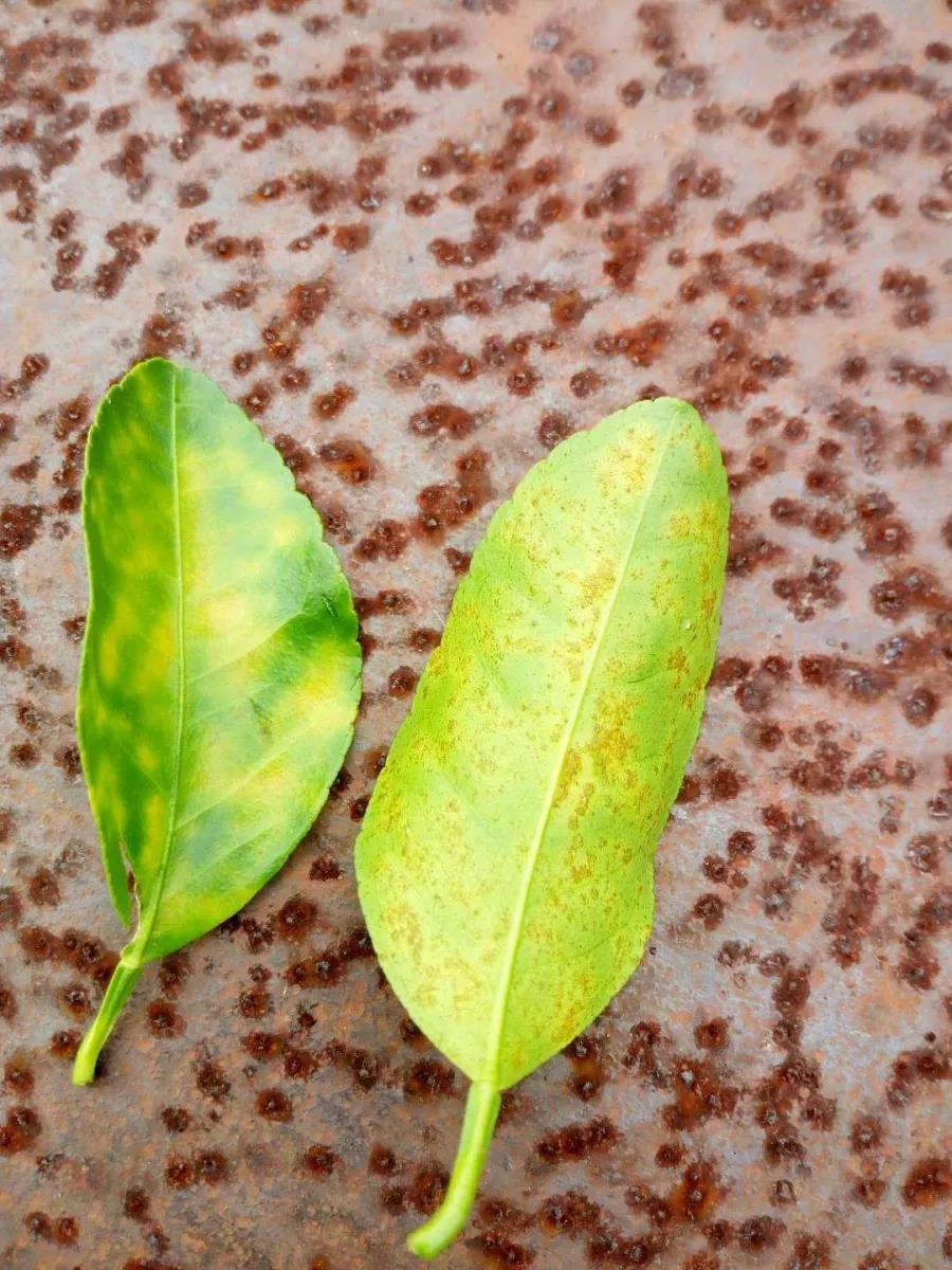 開始在葉背上出現褪綠針孔斑點,逐漸轉黃,后期發展為黑褐色的脂斑;葉片正面出現邊緣模糊的黃色脂斑。多發生在春梢。