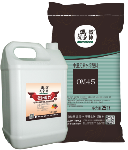柑橘的品質(zhì),主要由三個(gè)因素決定,分別是果個(gè)、果色、口感。先說(shuō)說(shuō)果個(gè),對(duì)于有些柑橘品種,比如說(shuō)貢柑、沃柑,它都需要一定的果個(gè),通常至少是70到80之間比較合適,因此當(dāng)果個(gè)偏小時(shí),現(xiàn)在天氣又比較干旱,我們可以沖一次水肥。沖水肥的時(shí)候,一定不要用高氮的配方。建議用微補(bǔ)調(diào)力,它主要由磷鉀組成,既調(diào)酸又補(bǔ)磷鉀,再加上微補(bǔ)OM45,補(bǔ)速效有機(jī)質(zhì),都能讓果個(gè)在增大的同時(shí),還能讓糖分增加。