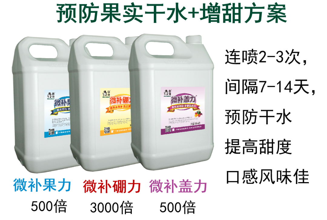 柑橘要預防減少干水,微補果力500倍+微補硼力3000-4000倍+微補蓋力500倍,連噴2-3次,對于減少后期果肉干水,提高果面光潔度都有很大的幫助。