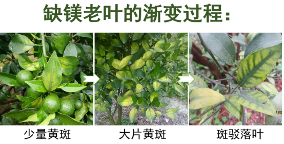柑橘缺鎂癥狀周年都可發生,在開始結果期和果實膨大期發生最多,老葉和果實附近的葉片首先表現明顯缺鎂癥狀。