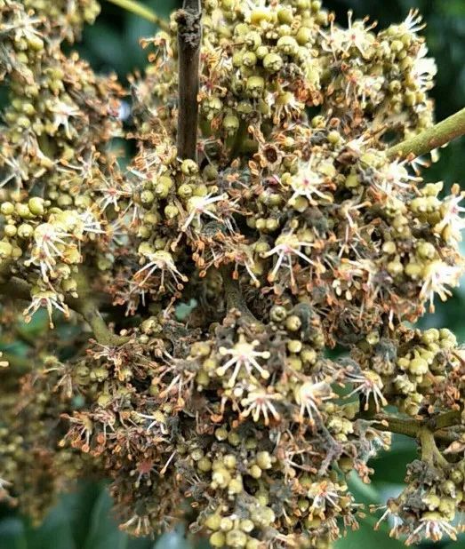 01 冬末春初天氣變化大,忽冷忽熱,晴雨無常,冬季容易萌發冬梢消耗樹體營養而影響花芽分化,春季抽吐花穗多帶小葉,甚至出現“沖梢”現象,嚴重影響花朵質量。 02 開春來花多,但是花不夠健壯,雌雄花比例不合適,可能只開花不結果。 03 荔枝易缺素,如果樹勢弱、黃葉多,光合物質積累少,也不利于成花,尤其是缺少鋅硼導致花弱、花穗稀疏、不夠粗壯,容易影響后期坐果。