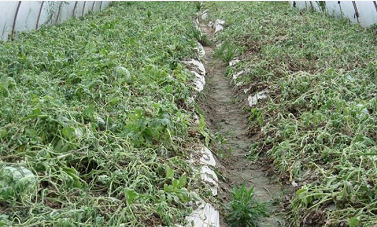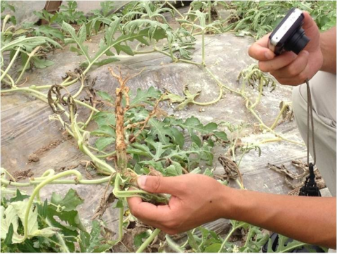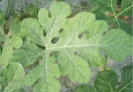 西瓜缺鈣時,植株頂端生長受阻,癥狀常表現在頂芽、根尖等新生部位;葉片發黃、卷曲,頂部葉蔓可變褐枯死;還會影響花芽分化,雌花畸形,果蒂部出現凹斑、開裂、褐腐甚至壞死形成臍腐果。