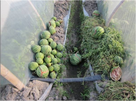 示范 對照 對照棚西瓜多是0.5-1.5斤 示范棚西瓜多是3-4斤