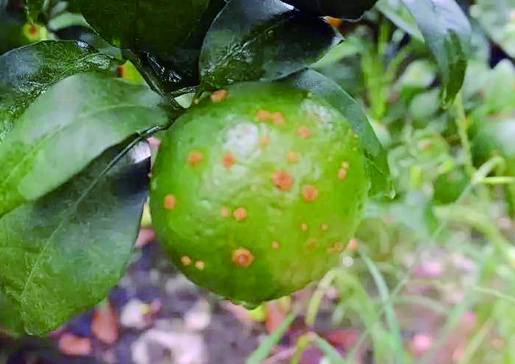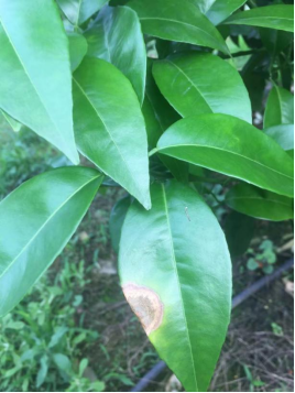 夏季雨后發生最多的病害,高溫高濕天氣和臺風暴雨后(果樹會出現大量傷口),病菌伺機侵入,主要危害植株的葉片和果實,防治不及時會造成柑橘大量出現落葉、枯梢、干枝、病果等問題,再加上柑橘潰瘍病具有爆發性強、傳播速度快、病害后果重的特點,容易發生惡性循環。現在要重點防控潰瘍病,預防雨后高溫大爆發,還要防止潰瘍病上果,減少對果實的影響。