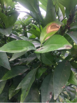 長期降雨的地方發病更重,降雨量越多則病情增長率就越高。在脂點黃斑病發生嚴重的果園內,常見大量積水,并伴隨漚根黃化的現象。持續降雨、洪澇災害等天氣狀況發生時,若果園缺乏良好的排水系統,將大大提高脂點黃斑病的發生率。