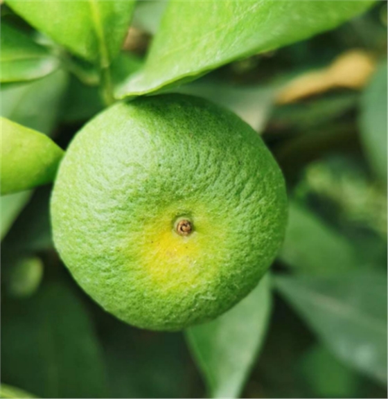 臍黃病一般多發(fā)于臍橙類,發(fā)生初期葉片不發(fā)生變化,首先在果臍發(fā)黃,之后黃色加深,擴展到整個果臍,使果臍萎縮,而后黃斑迅速擴大至周圍組織,果面發(fā)生三分之一時即可造成落果。