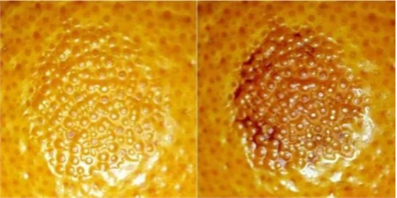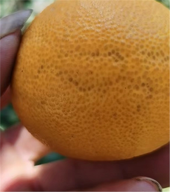初期果皮出現(xiàn)形狀不規(guī)則的淺綠色或淡黃色的病斑,病斑內(nèi)油胞顯著突出,油胞間的組織稍凹陷。隨著病情的發(fā)展,油胞逐漸萎縮,雖然該病不會(huì)繼續(xù)向下發(fā)展,但易被其他病原菌侵染,誘發(fā)炭疽病、青霉病等。